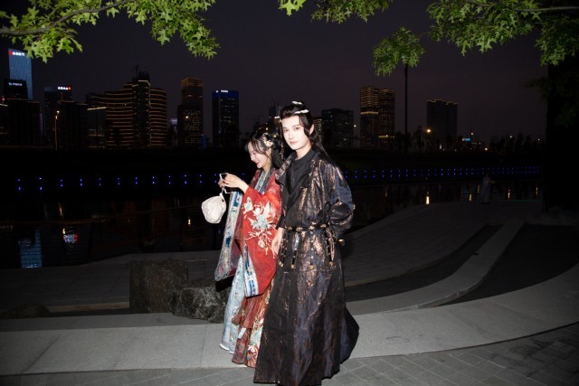 运动员村,中秋前夕展示中国传统服饰的工作人员。