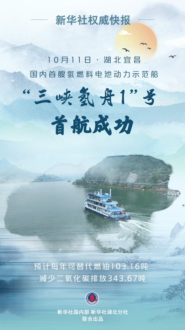 氢燃料电池动力示范船“三峡氢舟1”号10月11日上午在湖北宜昌三峡游客中心(九码头)完成首航,这标志着氢燃料电池技术在内河船舶应用实现零的突破。据测算,“三峡氢舟1”号相比传统燃油动力船舶,预计每年可替代燃油103.16吨,减少二氧化碳排放343.67吨。