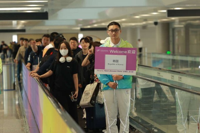10月14日,杭州亚残运会抵离服务全面启动,韩国体育代表团抵达杭州,“小青荷”志愿者举牌引导。杭州机场供图