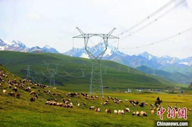 资料图:750千伏输电线路横穿南疆巴音布鲁克草原,环境生态和谐共生。张利民 摄