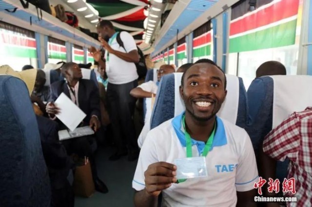 资料图:当地时间2017年5月31日,蒙巴萨至内罗毕标准轨铁路通车仪式在肯尼亚蒙巴萨举行,期间一名旅客展示自己的车票。中新社记者 宋方灿 摄