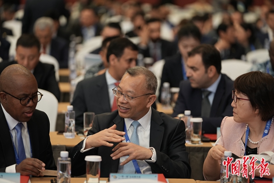 10月17日,北京国家会议中心,第三届“一带一路”国际合作高峰论坛企业家大会开始前,与会代表和嘉宾在会场交流。中青报·中青网记者 李隽辉/摄