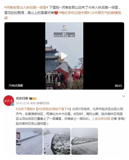 而在此之前,河南老君山就已经迎来了入秋以来的第一场雪,甚至在北京延庆的高海拔山区也迎来了降雪。