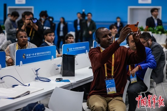 10月18日,北京国家会议中心,第三届“一带一路”国际合作高峰论坛新闻中心内,各国记者通过大屏幕观看论坛开幕式。中青报·中青网记者 曲俊燕/摄