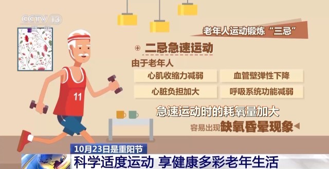 二忌急速运动。由于老年人的心肌收缩力减弱,血管壁弹性下降,心脏负担加大,再加上呼吸系统功能减弱,急速运动时的耗氧量加大,容易出现缺氧昏晕现象。