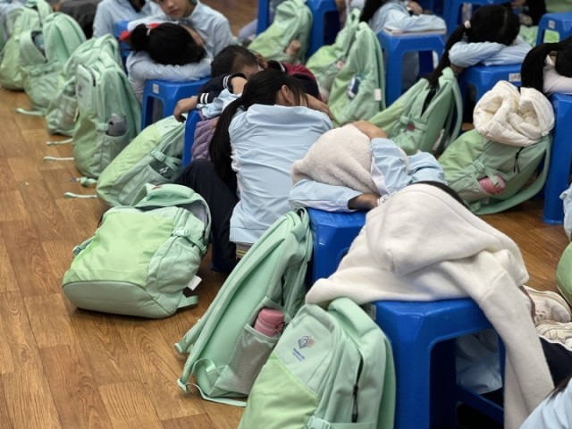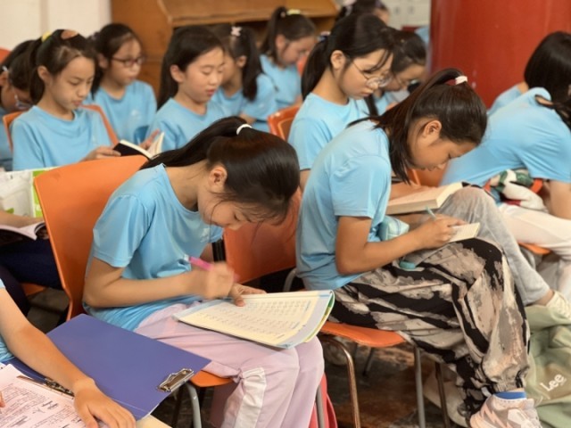 除了排练,他们还有作业和日常生活。排练现场,时常能见到孩子们在奋笔疾书或者抓住碎片时间小憩,作业和打卡一次都没落下。“我们日常通知排练的时候,也会喊他们带上作业,即便在开幕式上,后台还码着他们的书包,作业都是随身携带的。”