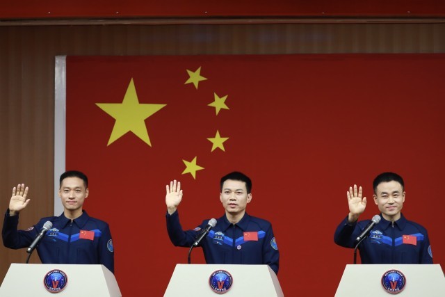 北京时间10月25日11时,执行神舟十七号载人飞船飞行任务的航天员乘组汤洪波、唐胜杰、江新林3名航天员在酒泉卫星发射中心问天阁与中外媒体记者集体见面。