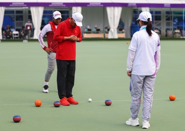 与其他许多残疾人运动项目一样,引导员在草地掷球比赛中也发挥着重要作用。本届亚残运会,中国草地掷球队派出的大多是视力障碍选手,引导员就是他们的眼睛,有些还是此前与参赛队员一同参加过试训的前队友。