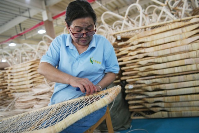 工作人员在位于汉中市的陕西良顺匠心实业有限公司编织藤制品(2023年9月7日摄)。新华社记者 张曼怡 摄