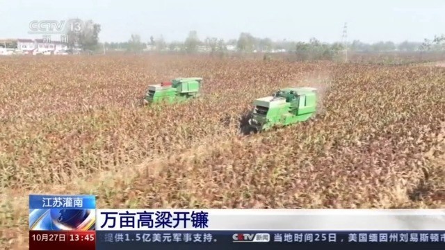 在江苏灌南,万亩高粱开镰收获。一台台大型收割机将粒粒高粱收入囊中。