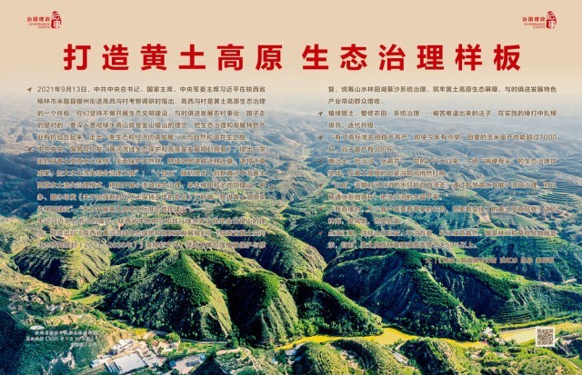 ◇2021年9月13日,中共中央总书记、国家主席、中央军委主席习近平在陕西省榆林市米脂县银州街道高西沟村考察调研时指出,高西沟村是黄土高原生态治理的一个样板,你们坚持不懈开展生态文明建设、与时俱进发展农村事业,路子走的是对的。要深入贯彻绿水青山就是金山银山的理念,把生态治理和发展特色产业有机结合起来,走出一条生态和经济协调发展、人与自然和谐共生之路。
