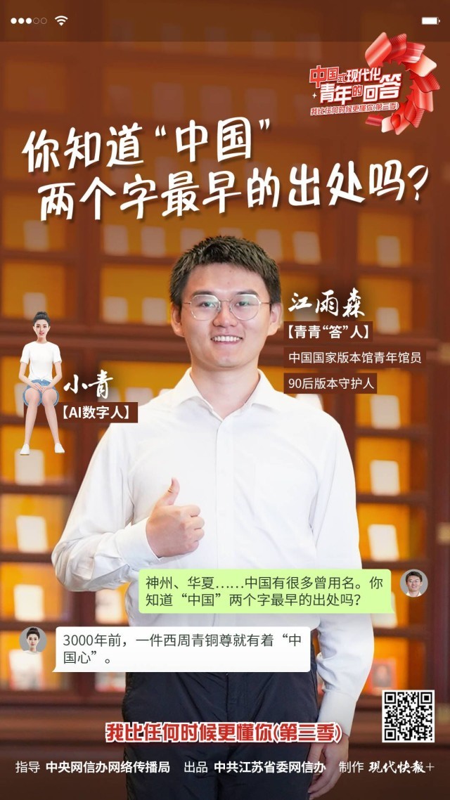 推进中国式现代化这张时代考卷,当代青年应该如何作答?2023年,由中央网信办网络传播局指导,中共江苏省委网信办出品,现代快报+制作推出“中国式现代化·青年的回答——我比任何时候更懂你(第三季)”系列短视频。从炎炎烈日到秋意冉冉,30位青青“答”人携手AI数字人小青,奔赴全国23个城市,以青春之力、以奋斗之姿,回答着青春之问,担负起青春之责,共同书写中国式现代化新答卷。