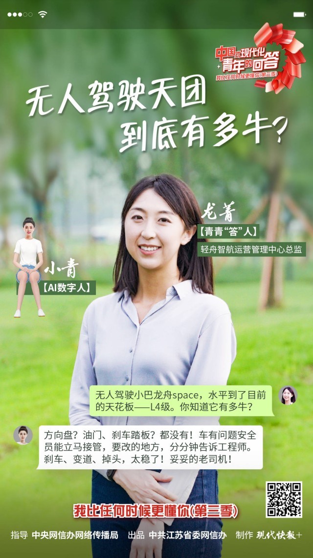 10月28日,“中国式现代化·青年的回答——我比任何时候更懂你(第三季)”系列短视频之《无人驾驶天团到底有多牛?》正式上线。本集视频中,青青“答”人——轻舟智航运营管理中心总监龙菁和AI数字人小青为大家讲述了我国目前智能驾驶技术的应用场景,以及技术给人们日常生活带来的巨大改变。