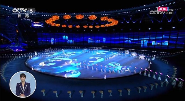 惜别之后是荷花传情。在闭幕式现场地面影像呈现的西湖碧水之上,绸伞与莲叶在呼吸间幻化,荷花姑娘在水面蜿蜒流转,形成了一朵盛放的荷花,同地面影像上曲曲层层的发光的莲叶一起,与江南夜色中熠熠发光的繁星交相辉映。
