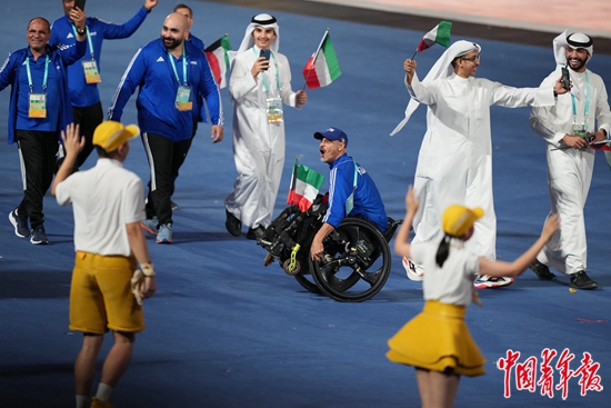 10月22日,杭州第4届亚残运会开幕式上,科威特代表团入场时,一名轮椅代表与志愿者“斗舞”。中青报·中青网记者 李峥苨/摄