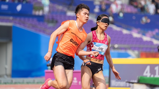 10月28日,杭州第4届亚残运会女子400米T11级决赛中,中国选手刘翠青(右)与领跑员陈圣明(左)以56秒53打破赛会纪录夺冠。视觉中国供图