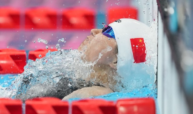 图为2021年8月30日,卢冬在东京残奥会游泳女子50米仰泳S5级决赛中率先抵达终点。新华社记者才扬摄