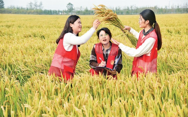 近年来,江苏省连云港市东海县审计局为确保丰收粮食储备安全,以日常检查和专项审计检查相结合,严审粮油物资储备台账、实物库存、粮食质量、档案管理等情况。图为2022年10月21日,东海县审计局粮食储备安全专项审计工作人员在高产稻麦农业产业园区检测即将丰收的水稻实产情况。 中新社发 张正友/摄