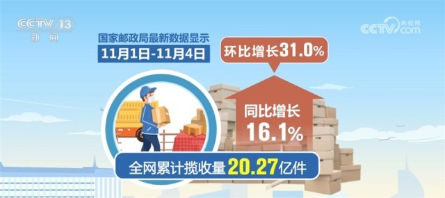 国家邮政局今天(11月5日)发布,快递业从11月开始迎来业务旺季。最新数据显示,11月1日至11月4日,全网累计揽收量20.27亿件,同比增长16.1%,环比增长31.0%。今年快递业务旺季从11月1日开始,到2024年春节前夕结束,时长102天。