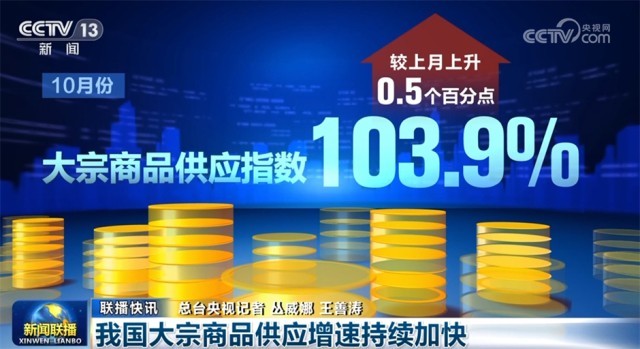 中国物流与采购联合会今天(11月5日)公布,10月份中国大宗商品指数为102.8%。其中,大宗商品供应指数为103.9%,较上月上升0.5个百分点,指数三连升至近期高点。各主要商品中,铁矿石、煤炭、有色金属和汽车供应量继续增长,并且增速加快。