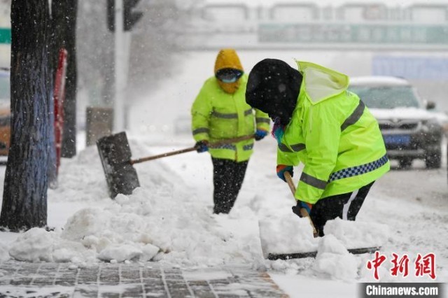 11月6日,环卫工人在清理哈尔滨市街路上的积雪。赵宇航 摄