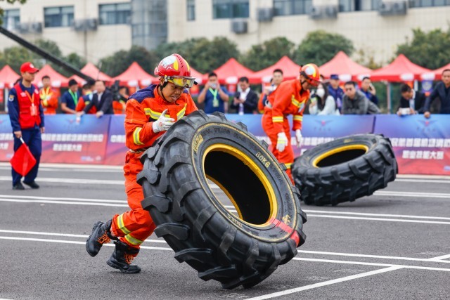 2023年10月25日,来自中南六省的参赛队员正进行个人消防技能综合操比赛。澎湃影像 图