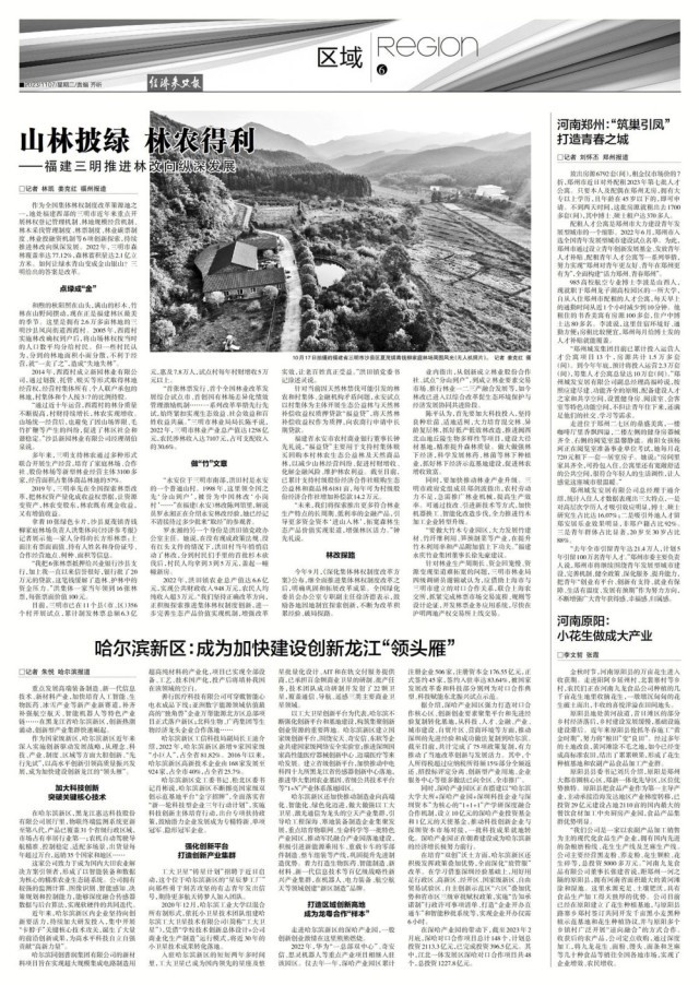 “首张林票发行、首个全国林业改革发展综合试点市、首创国有林场差异化绩效管理激励机制……一系列改革举措先行先试,始终紧扣实现生态效益、社会效益和百姓收益共赢。”三明市林业局局长陈平说,2022年,三明市林业产业总产值达1258亿元,农民涉林收入达7107元,占可支配收入的30.6%。