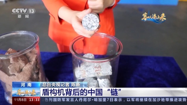 总台央视记者 陈晰:大家顺着我的手看过去,盾构机最前端的黑色组件就是刀具,这是整个产业链上的一个关键点。不同的地质需要用不同性能的刀具,比如这个花岗岩,就需要硬度很强的刀具,而这种泥沙岩,就得用柔韧性好的刀具。