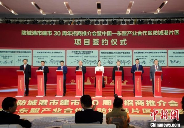 当天,由广西壮族自治区投资促进局、防城港市人民政府共同举办的防城港市建市30周年招商推介会暨中国—东盟产业合作区防城港片区项目签约仪式在防城港市举行。