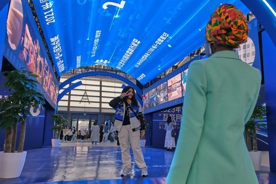 11月9日,浙江省桐乡市乌镇,2023年世界互联网大会“互联网之光”博览会,一位外国参观者正在与馆内“拾光隧道”合影。田嘉硕/摄
