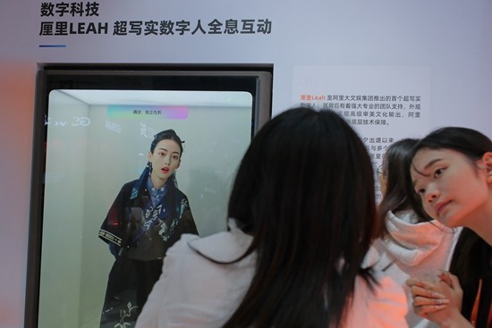 11月9日,浙江省桐乡市乌镇,2023年世界互联网大会“互联网之光”博览会,参会嘉宾正在向工作人员提问,与此同时,屏幕内的全息互动数字人也在倾听嘉宾的问题。田嘉硕/摄