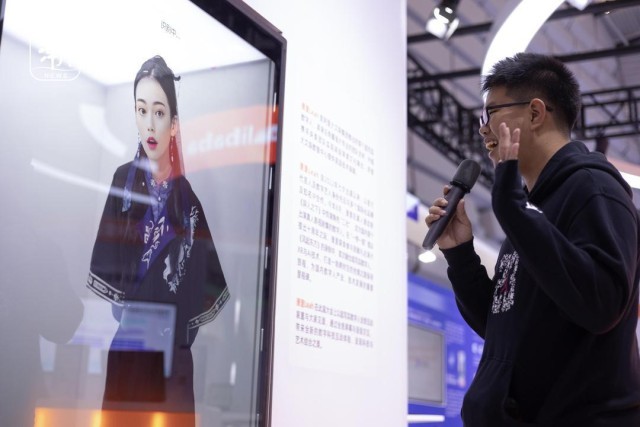 互联网之光博览会数字人讲解员向参展观众们娓娓道来展会概况。