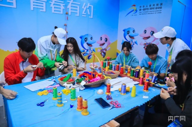 南宁市执委会志愿者管理人员梁柳观介绍,“志愿者之家”设置非遗展示中心是想借助学青会让来自全国各地朋友更好地了解和体验广西的非遗文化。这几天,非遗展示中心也成为了运动员们的热门“打卡地”,现在每天都有300多人来参观体验,运动员们也都自己动手去制作非遗产品,给他们带回去留作纪念。