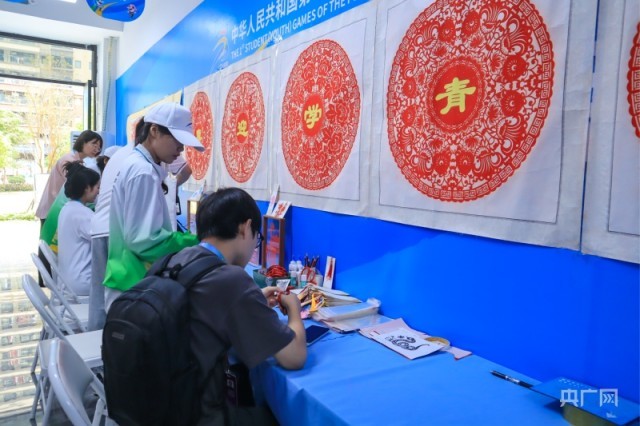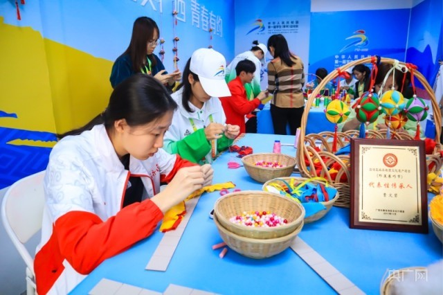 央广网南宁11月10日消息(记者梁瑜琳)11月10日,第一届全国学生(青年)运动会(以下简称“学青会”)赛场里激战正酣,赛场外同样热闹非凡。在学青会运动员村非遗展示中心,剪纸、绣球、壮锦、武陵牛角制品等具有广西特色、南宁特点的非遗手工艺产品集中亮相,吸引了不少运动员前来参观体验。