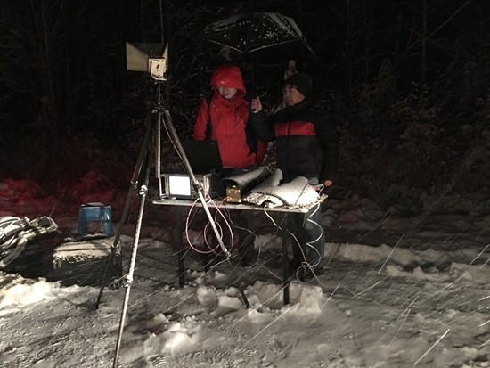 科研人员冒着风雪在长白山林道上进行电磁环境测量。中国科学院上海天文台供图