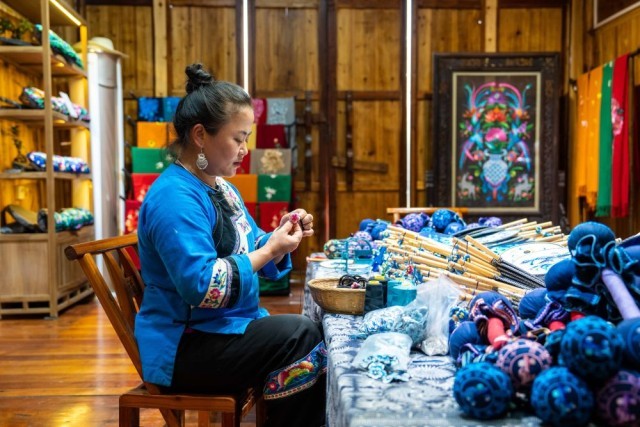 在湘西十八洞村,村民在十八洞苗绣乡村振兴示范基地制作苗绣工艺品(2023年10月11日摄)。新华社记者陈思汗摄