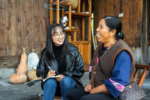 在湘西十八洞村,驻村干部杜霁(左)在走访村民(2023年11月1日摄)。新华社记者陈思汗摄