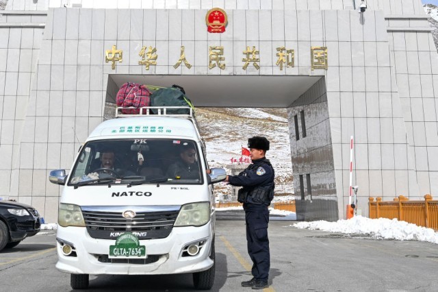 11月6日,新疆出入境边防检查总站红其拉甫边检站民警在国门对入境车辆进行查验。新华社发(王智珑 摄)