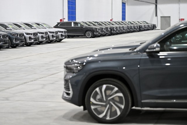11月7日,霍尔果斯亚欧国际供应链有限公司仓库内摆放的待出口的国产汽车。新华社记者李鑫 摄