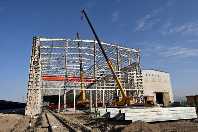 11月4日,中国铁路乌鲁木齐局集团有限公司阿拉山口站换23集装箱换装库和旁边正在建设施工的集装箱换装库。新华社记者李鑫 摄