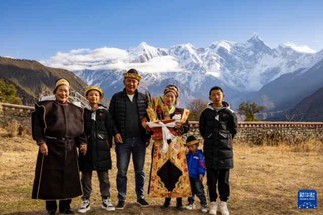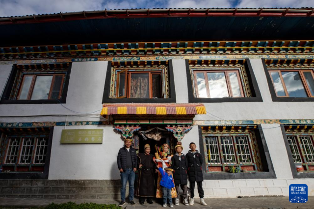 工布新年的大年初一,次仁顿珠(左一)和拉巴卓玛(左三)一家在自家房前拍摄全家福(11月14日摄)。新华社记者 黄耀漫 摄