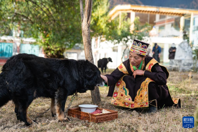 工布新年的大年初一,拉巴卓玛按照习俗“请狗赴宴”,为家里的狗端来了新鲜牛肉、糌粑和牛奶(11月14日摄)。新华社记者 丁增尼达 摄
