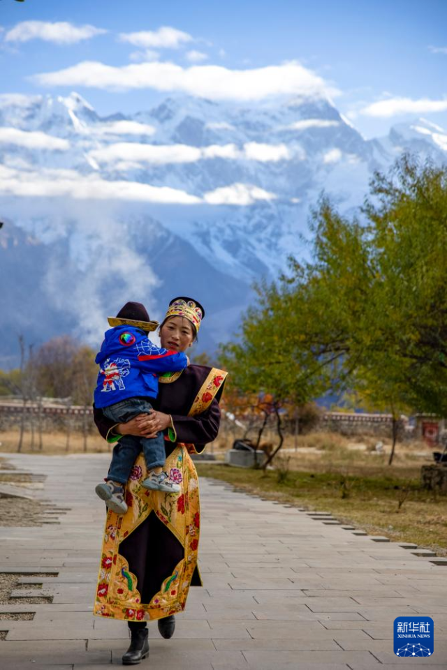 工布新年的大年初一,拉巴卓玛和儿子端着寓意五谷丰登的“切玛”在家门口祈福(11月14日摄)。新华社记者 姜帆 摄