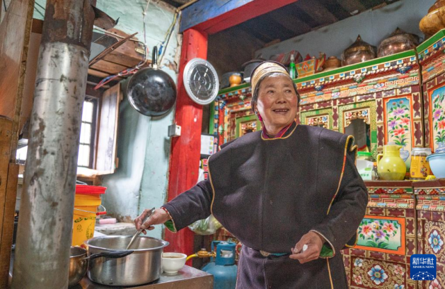 工布新年的大年初一,拉巴卓玛一早就穿着传统工布藏装开始忙碌(11月14日摄)。新华社记者 黄耀漫 摄