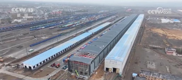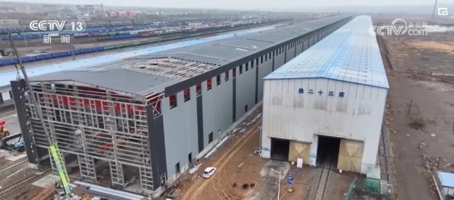 总台记者 崔宁:在我的身后有一小一大、一旧一新两座换装库,它们主要是对入境的中欧班列进行换装。小的这座看起来也比较旧,它建于2008年,到目前为止已经投用了整整15年。随着“一带一路”倡议的不断推进,现在经阿拉山口口岸出入境的中欧班列数量已经由最初月均3.5列增加到日均17列。所以,它的存在也已经远远不能满足现在发展的需求,也正因为如此,在它的旁边又新建了一座大的换装库,它建成投用之后将取而代之成为目前亚洲最大的室内集装箱换装库。