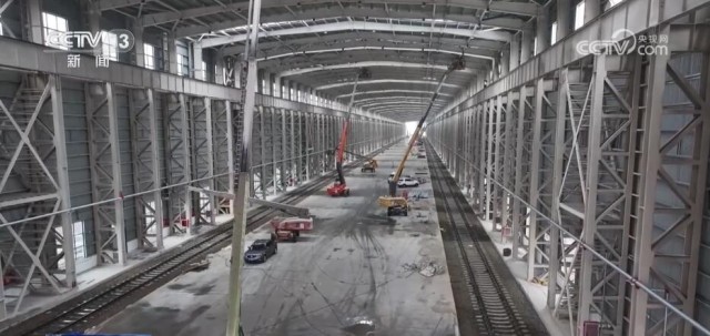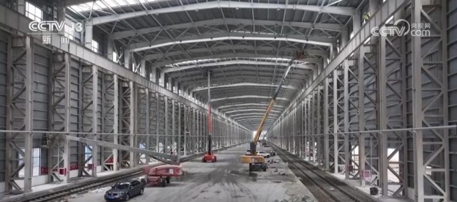 中铁一局阿拉山口室内集装箱换装库项目副经理 张刚:新库要比老库(宽)11.5米,这个堆放面积更大,两个准轨、宽轨分开以后,能够实现整列换装。而且(除了)采用桥吊方式来换装以外,还可以采用正面吊方式进行换装,换装效率大概提高50%左右。