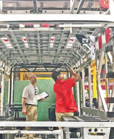 在位于美国加州兰卡斯特市的比亚迪大巴工厂里,工作人员正在检查设备。