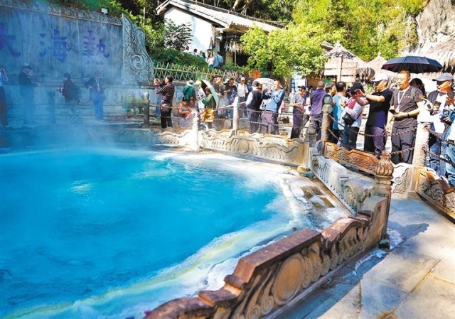 游客在腾冲市地热温泉“热海大滚锅”游览。