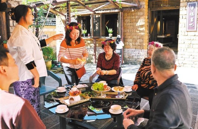 游客在腾冲市清水乡三家村中寨司莫拉佤族村乐享惬意慢生活。