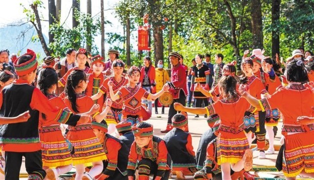 腾冲市清水乡三家村中寨司莫拉佤族村,村民身着盛装跳竹竿舞,其乐融融。